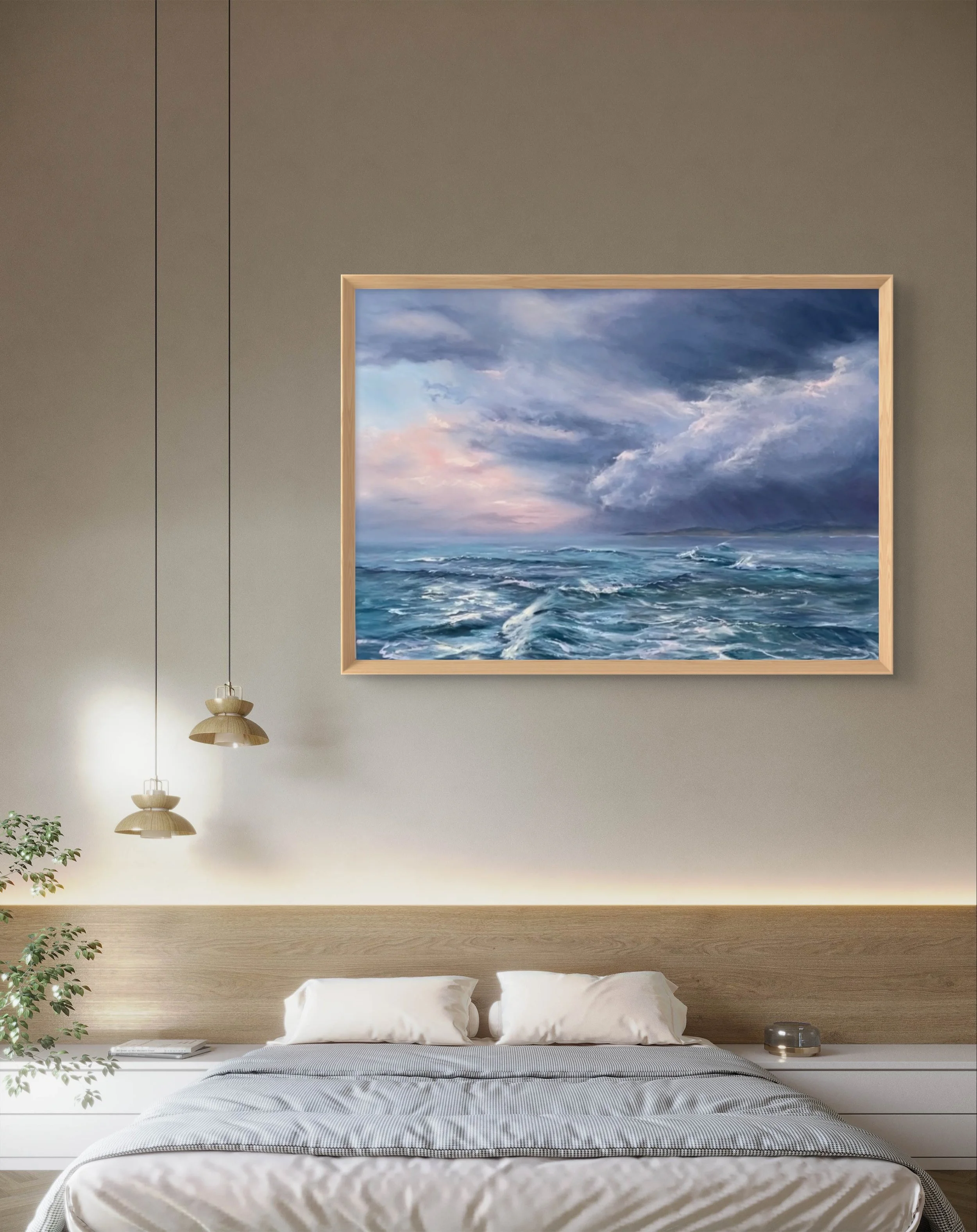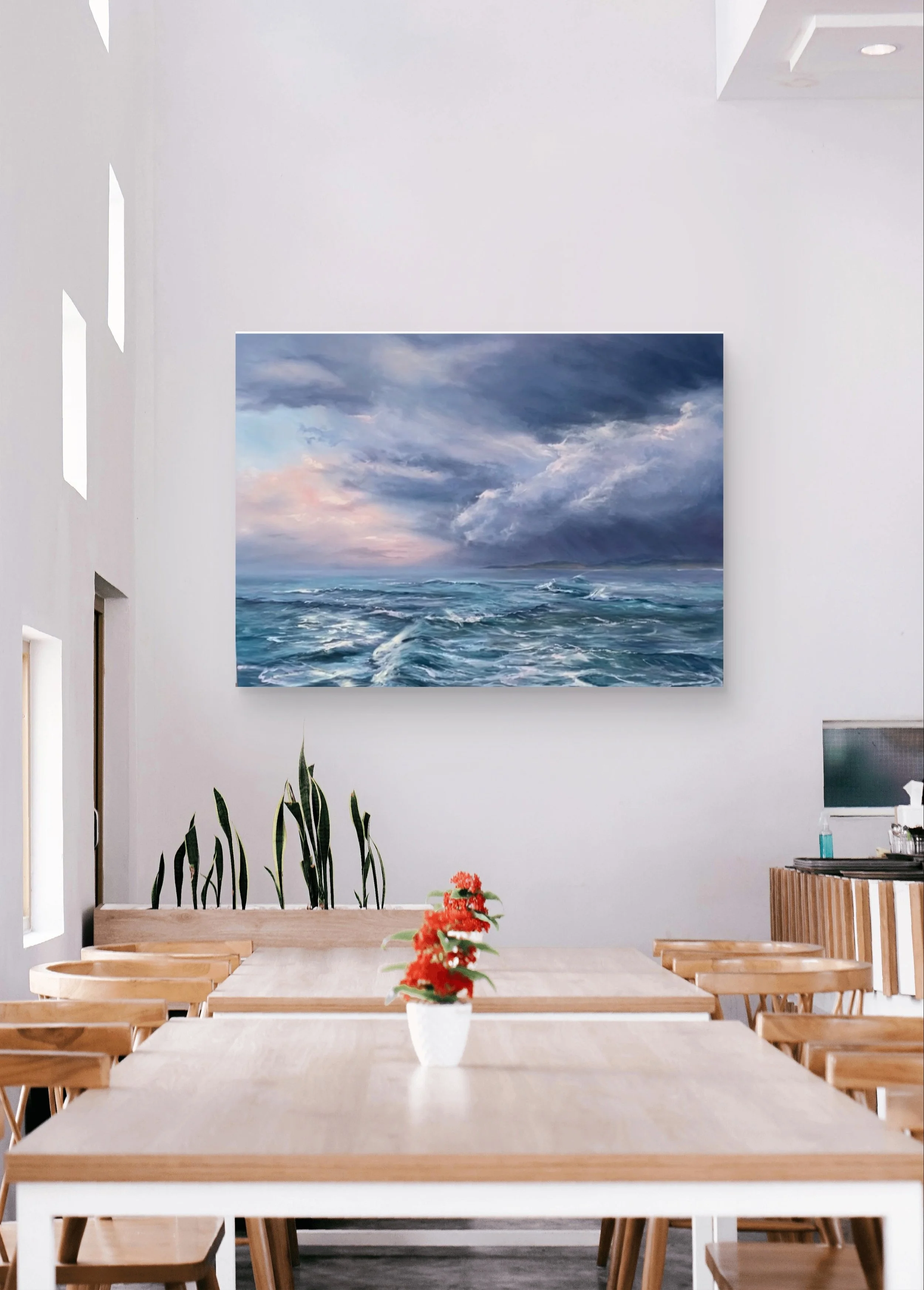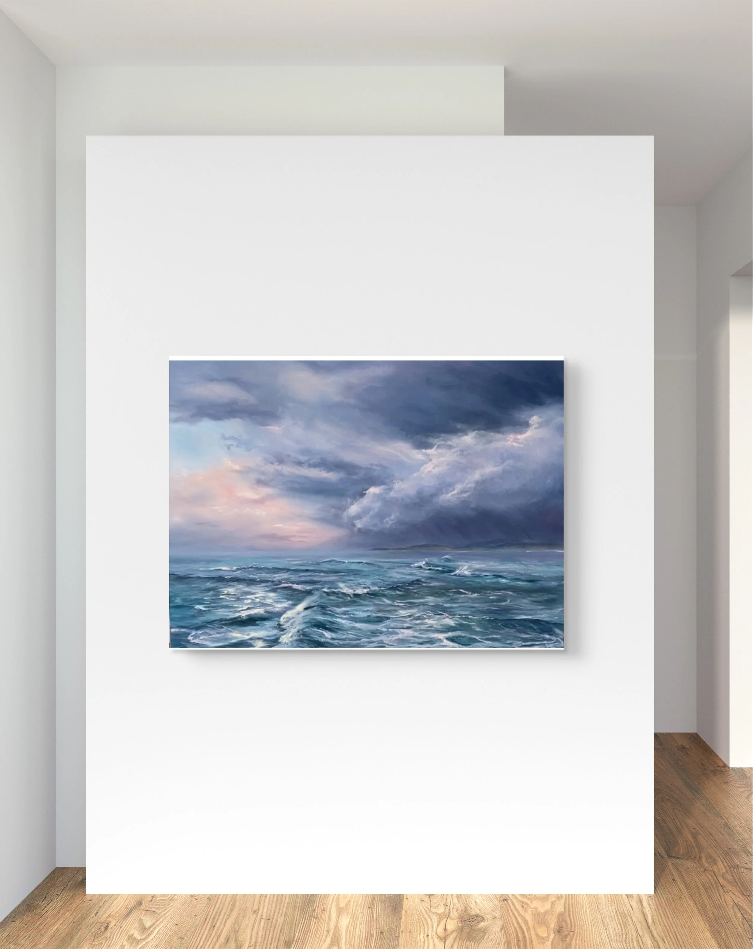 On a stormy day in 2024 I captured several photos as the ocean in the rip was whipped into a frenzy. This painting captures the wind whipping the waves in all different directions. The sky was amazing and although it was black in one direction a subtle warmth was emanating from the other direction. People lined the vantage points to watch the spectacle as it unfolded and I loved creating this work of art.